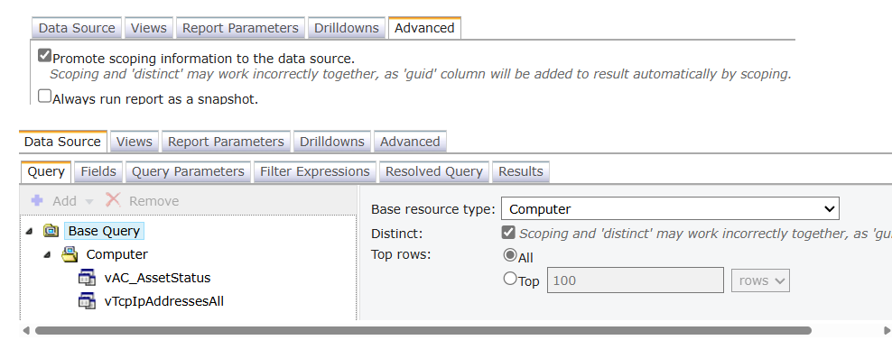 After creating a new report in Report Builder using the 'Distinct' filtering option, the resolved query and results tabs are correct and the query returns the expected results. However, when running the report, it is ignoring the 'Distinct' option and multiple rows of the same value are being returned.