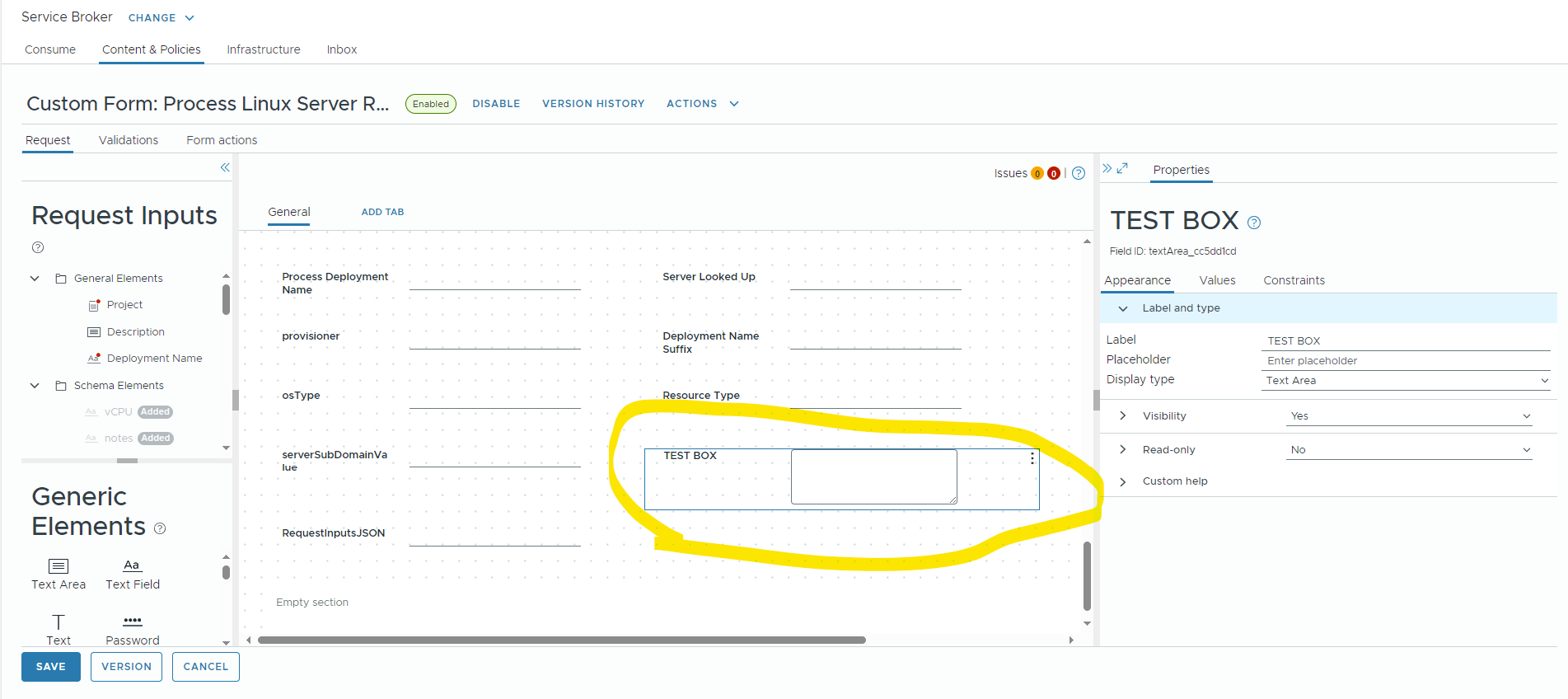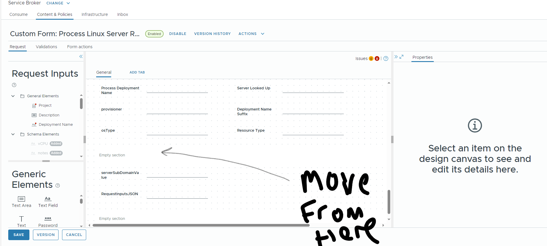 Adding a new field to the right side of a custom form under Service Broker> Content & Policies>Custom Form: Once the new field has been added, when you drag it over to the left row, this causes the field to disappear and turn into an empty field.