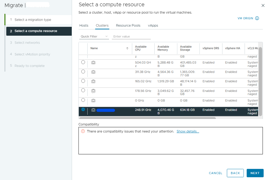 Pre-vSphere 8.0 Behavior: The "Migrate Compute Resource Only" workflow listed only hosts, clusters, resource pools, or vApps that had access to all datastores used by the VM. This was done to ensure only realistic migration targets were shown.