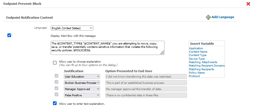 You configured an endpoint policy with the Endpoint Prevent: Block action but the blocking popup is not showing on macOS devices. Your response rule is configured with "Allow user to enter text explanation" but default Justifications are not enabled in the response rule via "Allow user to choose explanation" unchecked: