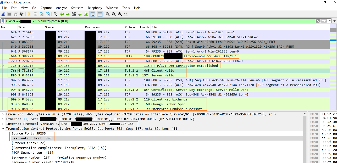 Here is the WireShark logs/screen where we can see that the connection is established with TLS 1.2