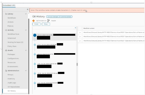 2.Embedded-vRO Git History shows “Error: The workflow name contains invalid characters (\, /).Name: null. ID: null”. as shown in the screen below;