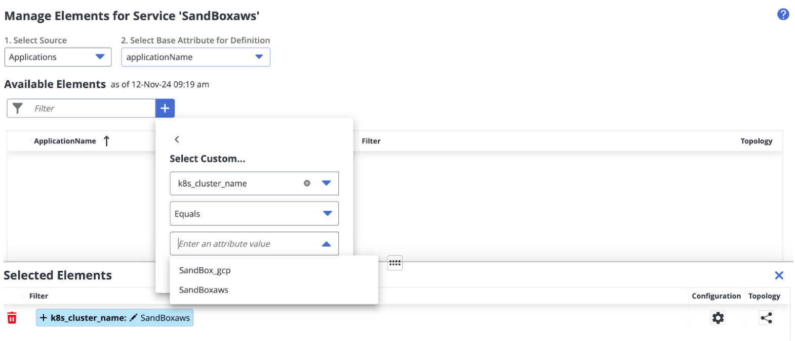 2. Manage Elements using the custom filter of Available elements and select the k8s_cluster_name and select the cluster you want to have as a service, for example "SandBoxaws"