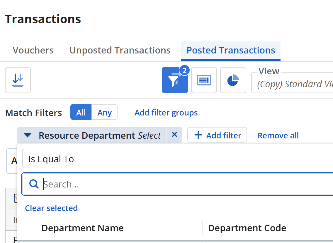 When in the Transactions > Posted Transactions, using the filter for Resource Department