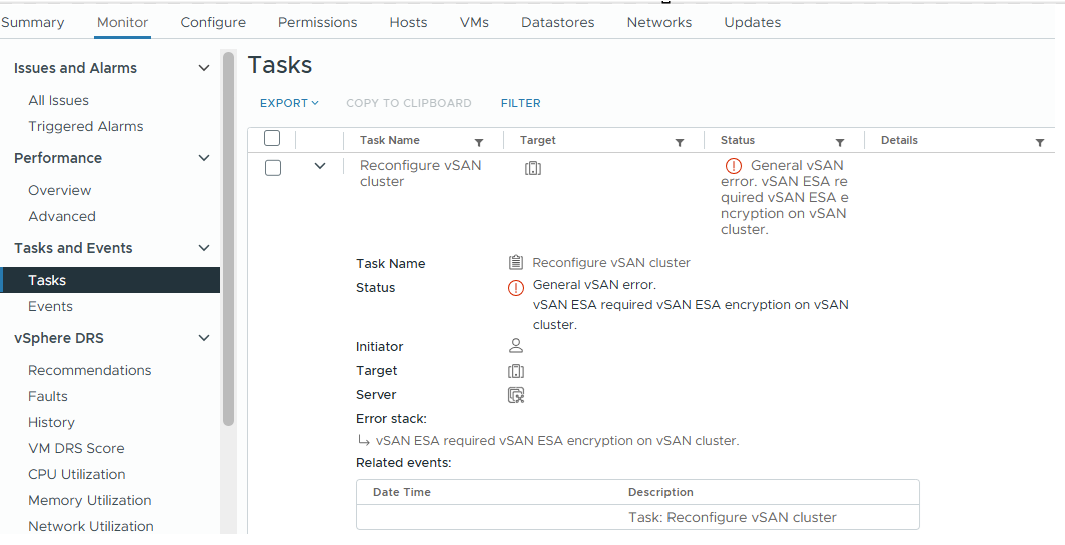 When trying to enable vSAN ESA with Encryption via the Web Client, the tasks fails with: