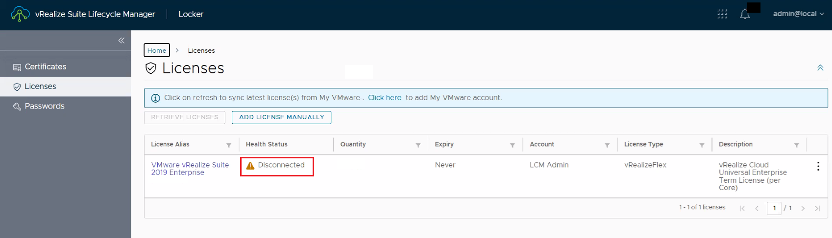 License health status showing as "Disconnected" when we Navigate to the Aria Suite Lifecycle portal -> Locker-> Licenses.