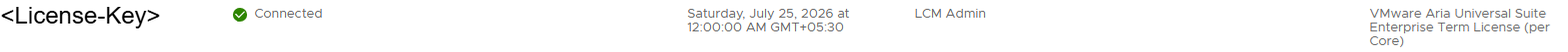 Following an upgrade to VMware Aria Suite Lifecycle 8.18, newly added license keys within the locker will be automatically appear 'Connected.' This status will persist unless the license is determined to be invalid or expired.