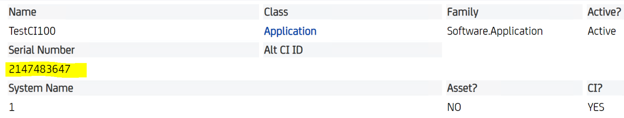 | 1 | Application | 3669687248 | TestCI100 | Active | Software.Application | B8075 | Xerox | Active |