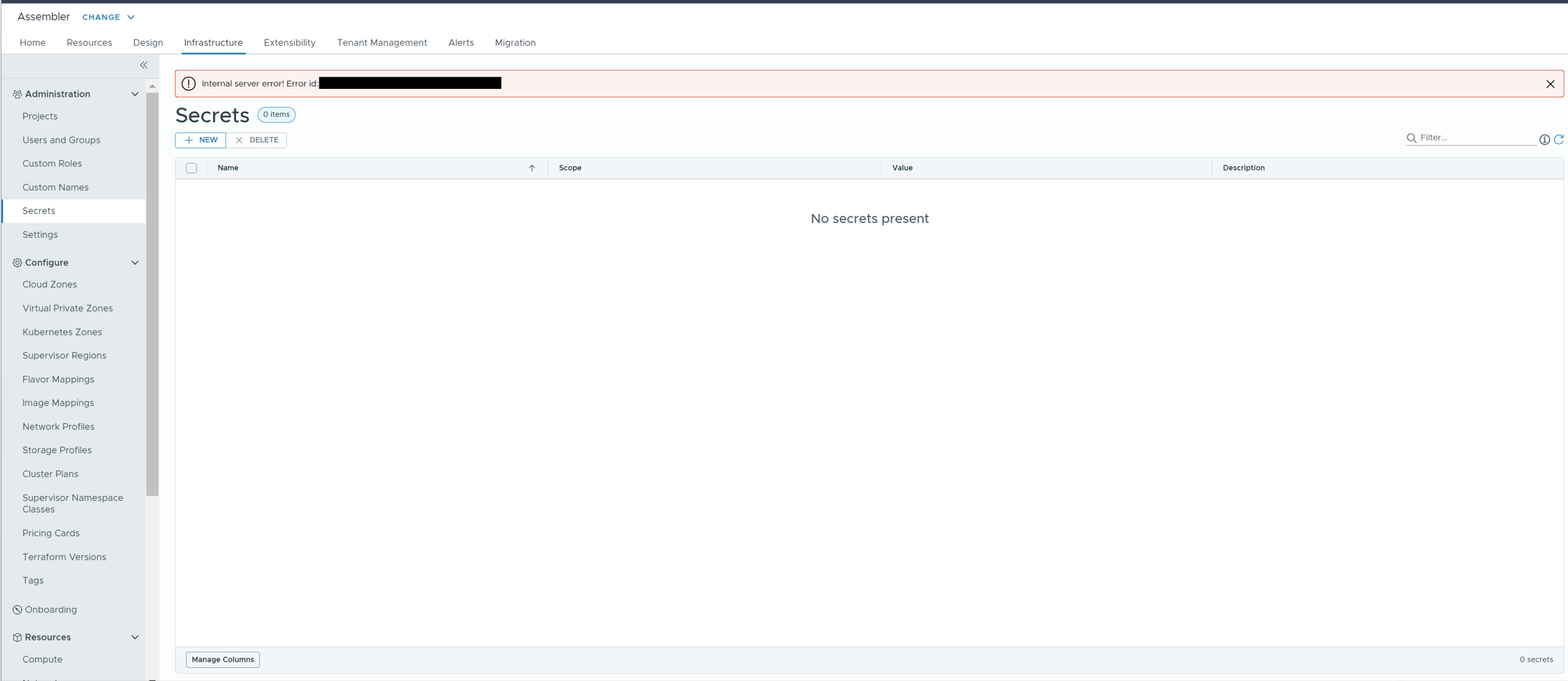 This is a known issue identified in version 8.18.0 of the code affecting the project service. Specifically, the Administrator->Secrets tab is attempting to interact with the /platform/api/secrets API, which is served by the project service. A bug in the code prevents the proper handling of this request, leading to the observed malfunction.