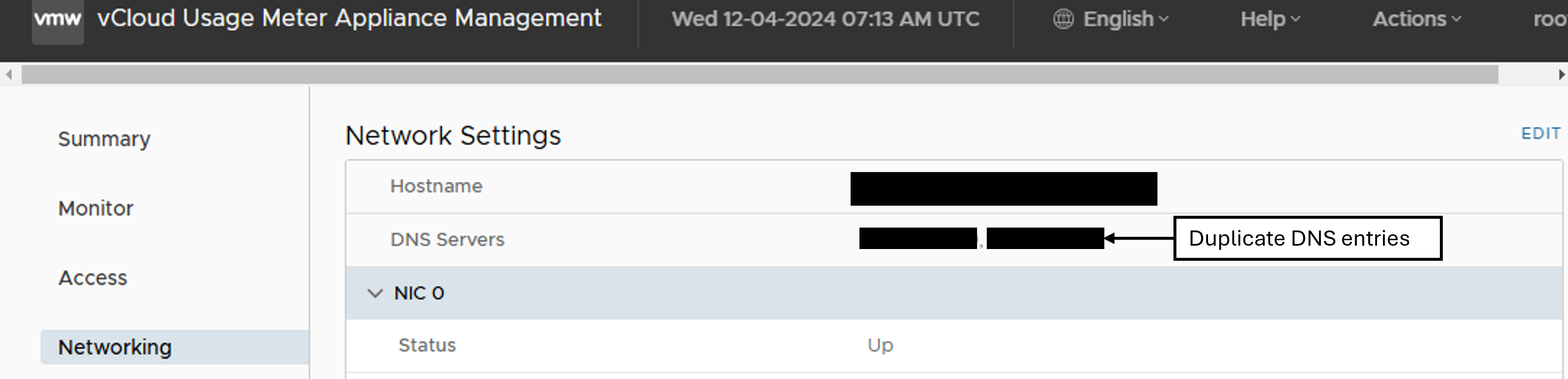 Saving DNS entries in Usage Meter 4.8 VAMI causes duplicate DNS entries. This is cosmetic issue and no impact to the appliance.