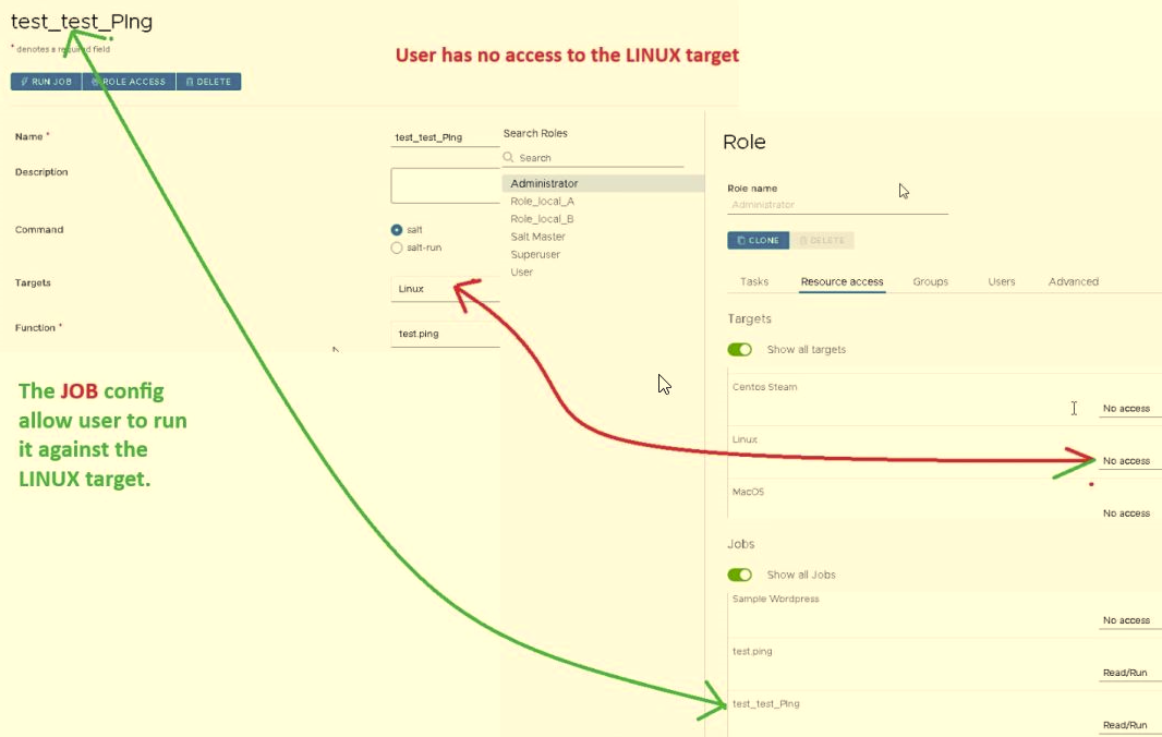 When Admin creates the JOB and explicitly assigns the target group to it, user can run the Job successful despite not having regular access to the target defined in the job.