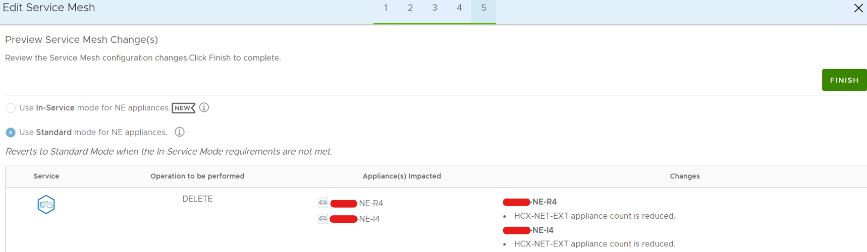 For instance, if there are 8 NE Appliances, with 4 of them used for HA (NE-I3, NE-I4, NE-I5, and NE-I6), the maximum number of NE Appliances that can be removed is 4 (NE-I1, NE-I2, NE-I7, and NE-I8), unless the HA is deactivated from the existing NE Appliances. The best way to validate this is through the Service Mesh (SM) UI, which shows a preview of the SM changes and allows you to confirm the changes by clicking the "FINISH" button before proceeding further.