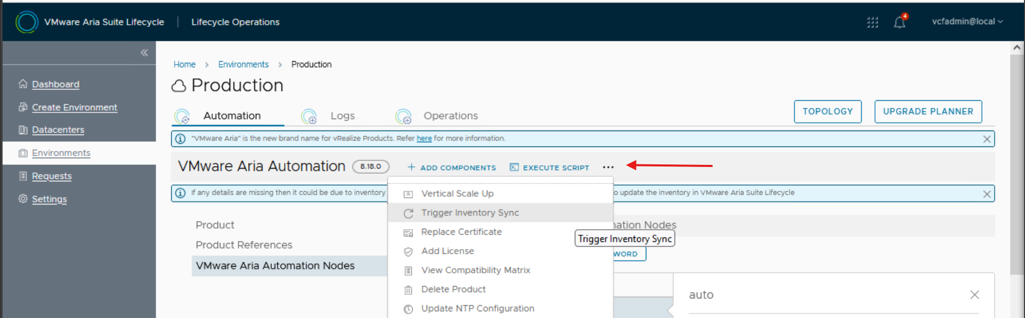 After updating the "Datacenters" account with a desired existing domain account, although the Locker in LCM shows that the "installervCenter" account is no longer in use, it still appears as the vCenter username/password account when navigating to Environments -> Select the datacenter -> Automation -> VMware Aria Automation Nodes -> expand a node: under the Infrastructure section the vCenter username/password isn't changed.