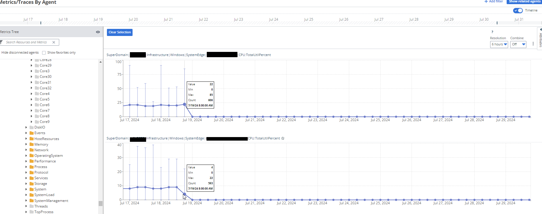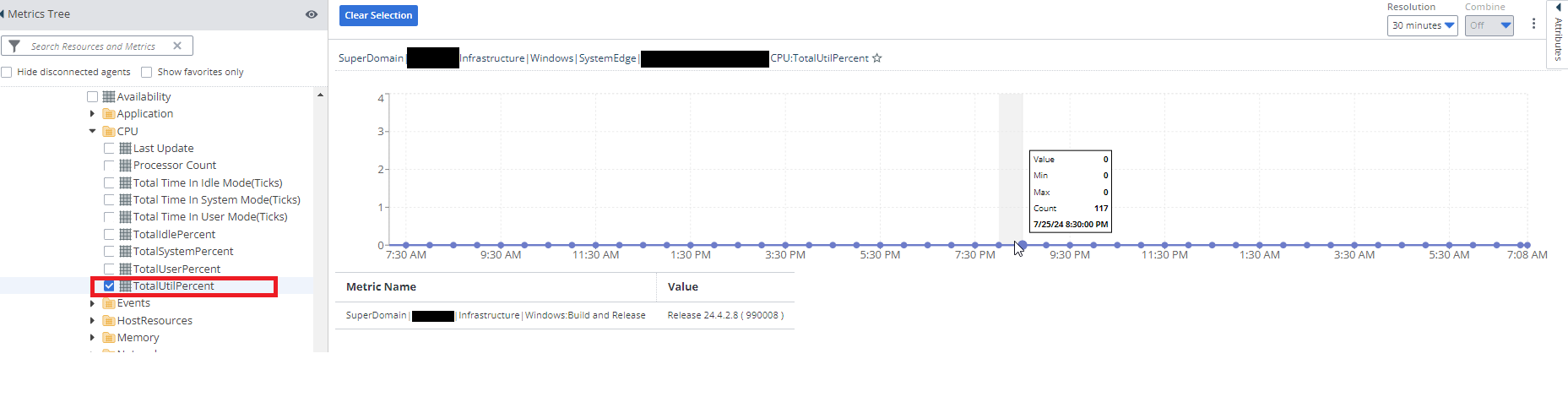 Post the crowd strike issue in windows in july 2024in few windows server APMIA CPU:TotalUtilPercent is always 0% and CPU core metrics also not displaying also not showing min max values as shown in the screen shot.