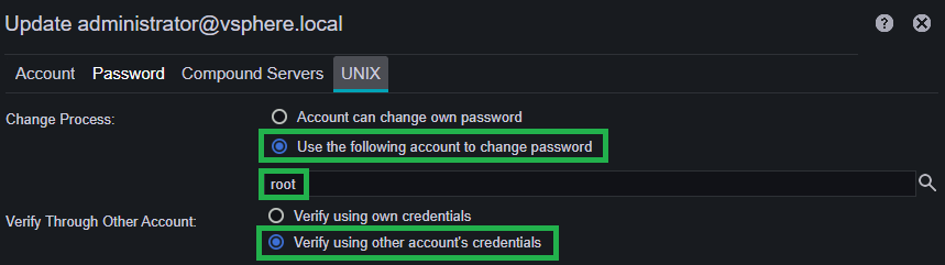 It is possible to manage this account with custom UNIX target application scripts for password verifications and updates. Since the account cannot be used to connect to the vCenter server, the root account would have to be configured in PAM, and the [email protected] account would be configured to have its password updated and verified by the root account: