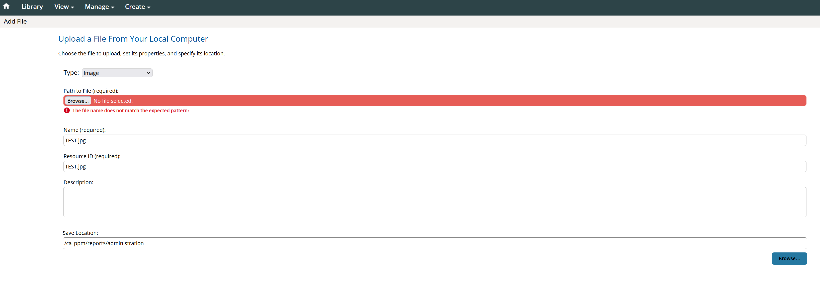 Trying to upload a file in Advanced Reporting results in an error message. For example, 'Image' or 'JRXML' file.