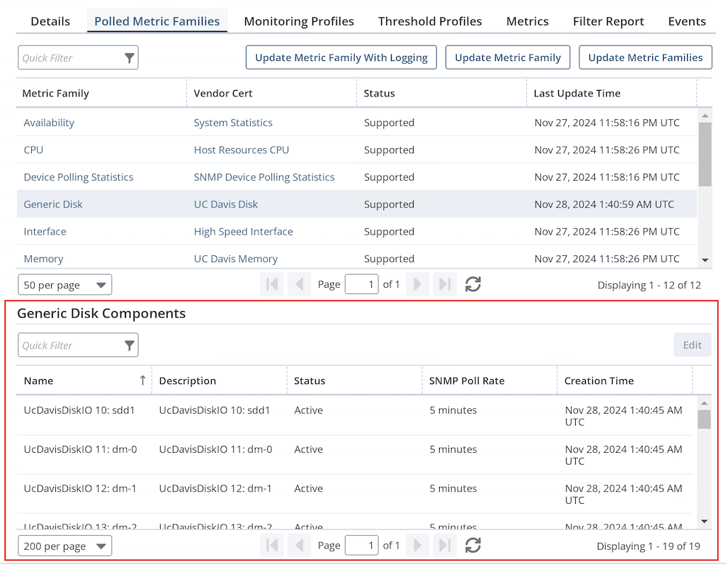 A disk can contain multiple partitions and UC Davis Disk Vendor Certification (VC) uses OIDs from 1.3.6.1.4.1.2021.13.15.1.1. These are the physical device.