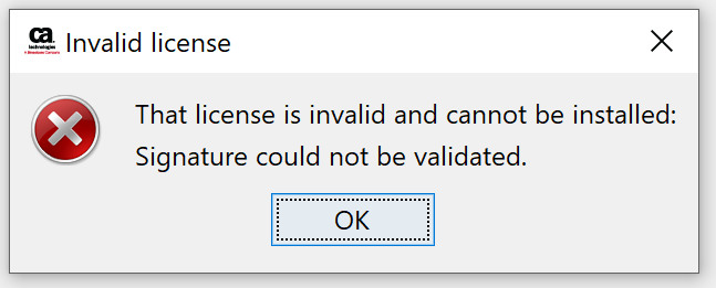 Invalid license: That license is invalid and cannot be installed: Signature could not be validated.