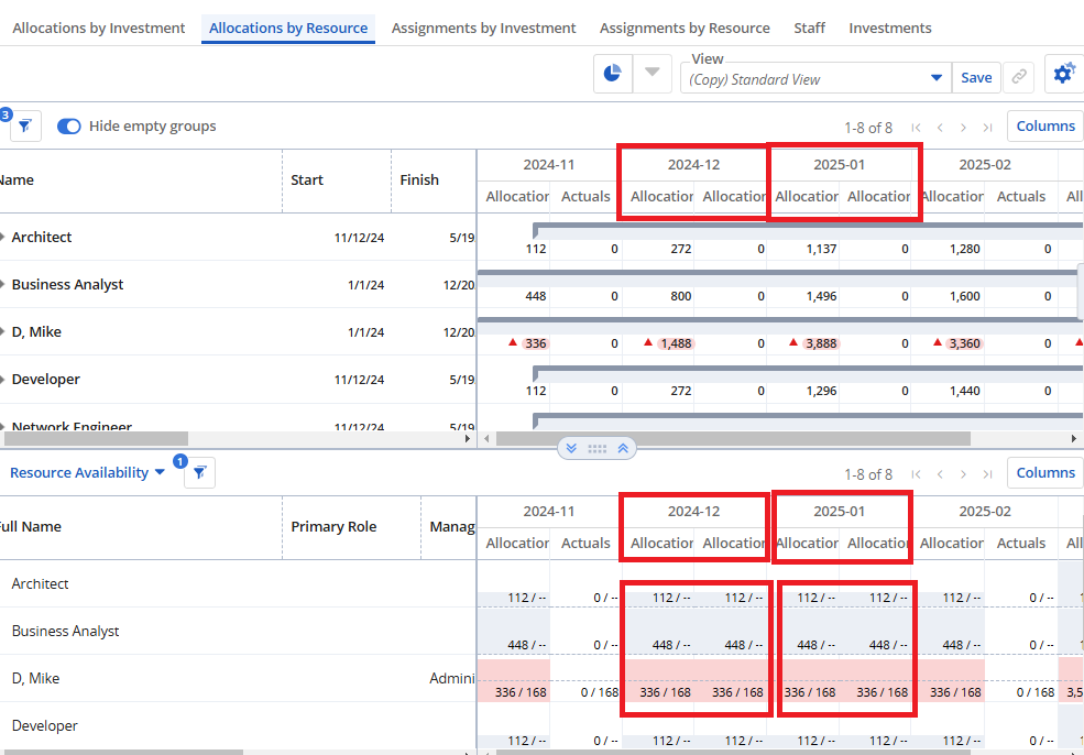 When configuring Staffing – Allocations by Resource and Allocations by Investments view to add Allocations Display with more metrics, the added columns display duplicated