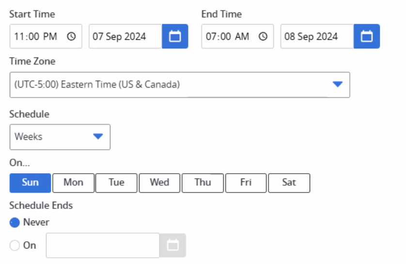 Start Time was for Sat. But the schedule started Sunday instead of Saturday. . Changed day to Saturday . Below shows set to Sun