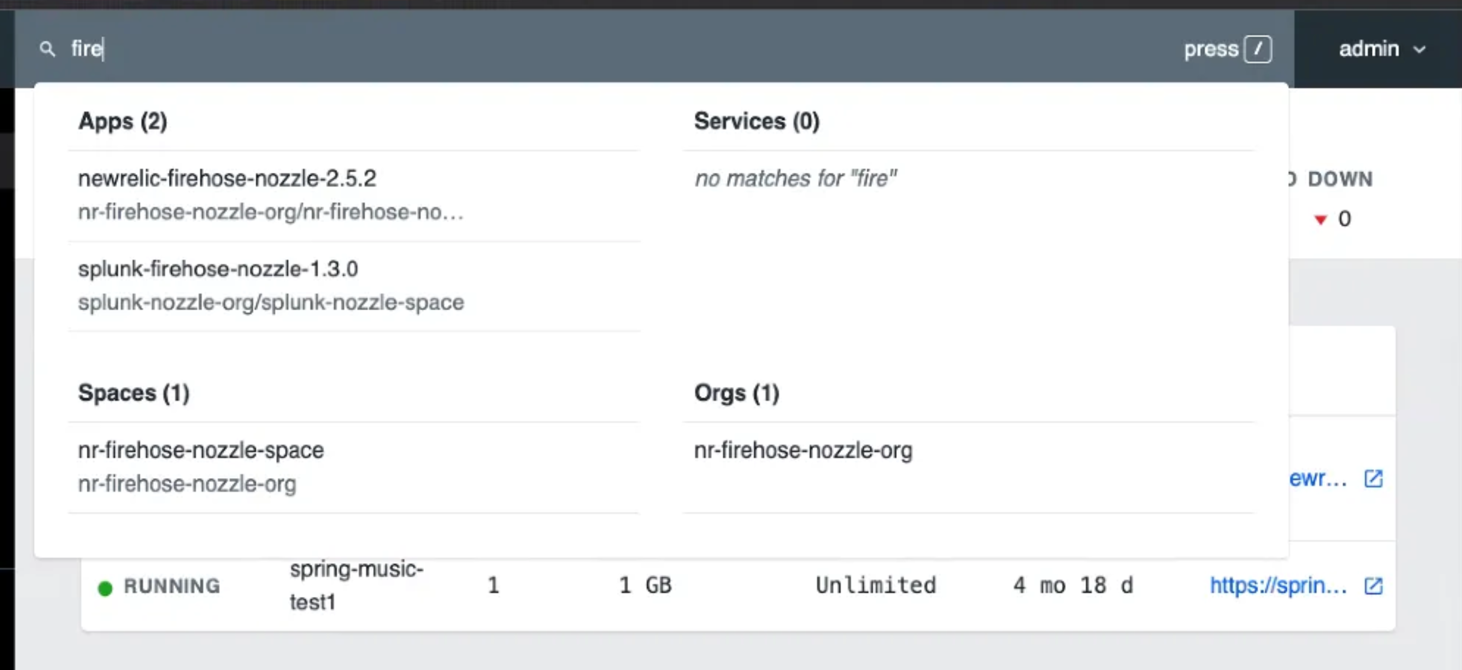 In this case, we can log into Apps Manager, and search for the keywords "nozzle" or "firehose":