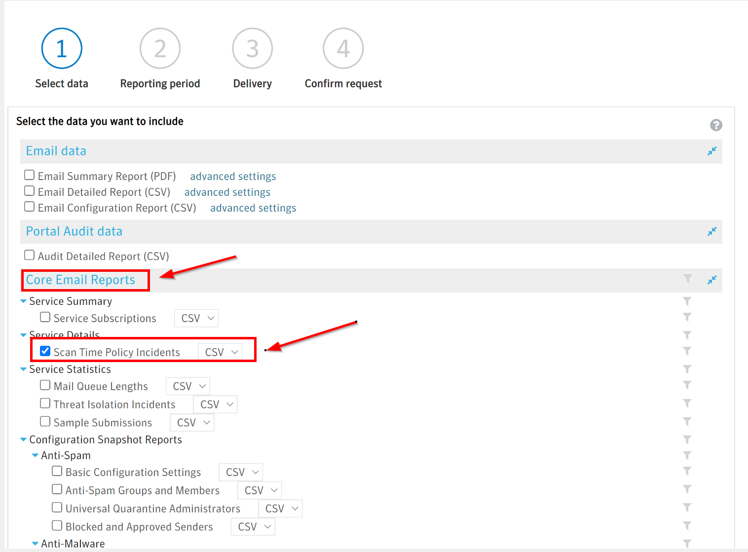 Locate Core Email Reports > Service Details, and select the box to the left of Scan-time Policy Incidents as shown in the below screenshot and then Click Continue.