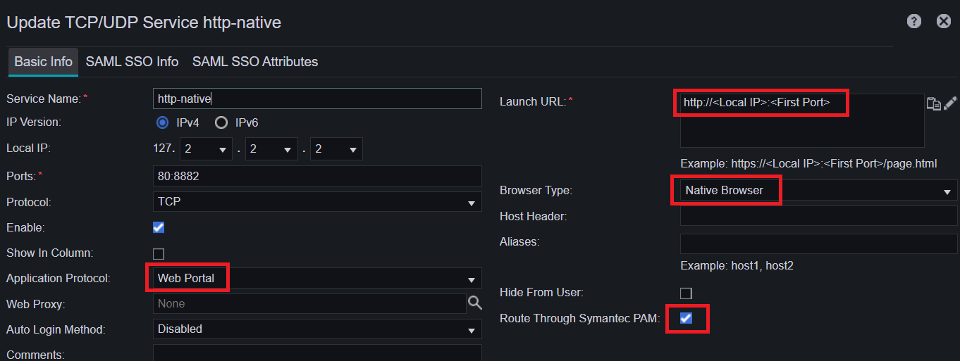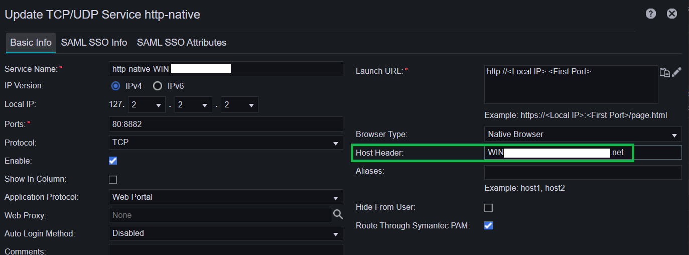 A Web Portal service configured in PAM and launched from the PAM client access page fails to connect to a virtually hosted IIS web service on a Windows host when using a native browser. The service is defined as follows: