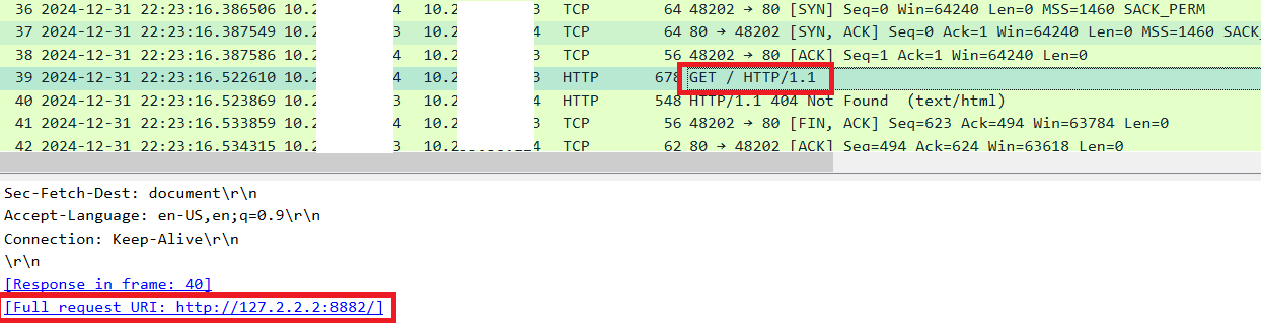 This is a limitation of how the PAM client works. When the PAM browser is used, PAM builds the URI string that the browser sends after the connection to the remote web server is established. Even though the connection goes through the local IP (127.2.2.2 in the example shown here), the PAM browser knows that the actual URI to connect to is http://<device address>[:<dest port>]. After the connection is established, it sends the HTTP request using this URI, as seen in a network trace between PAM server and target device: