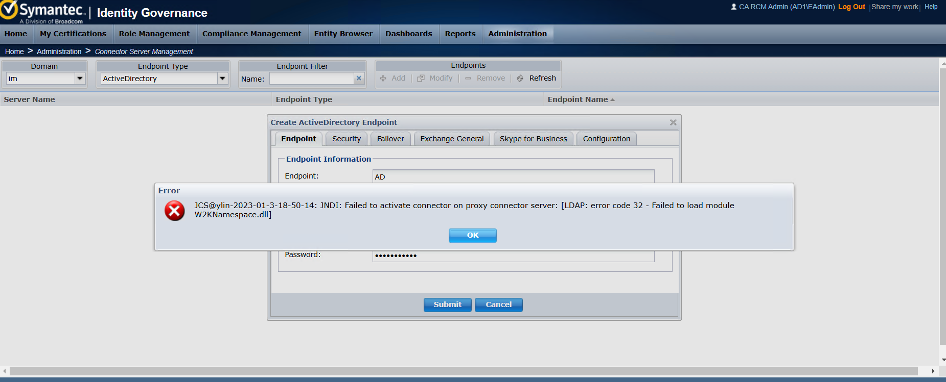 Getting the following error while configuring AD endpoint on the standalone connector server on Identity Governance
