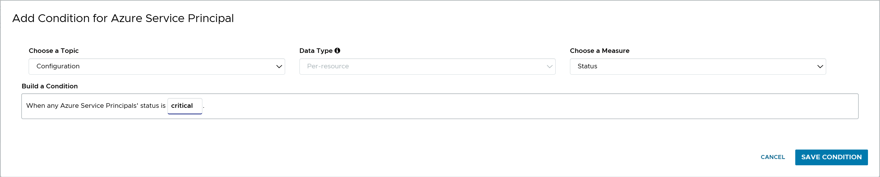 3. For the condition set the topic as configuration, and the measure as status, and set the "When any Azure Service Principals' status is" dropdown to critical as per the below -