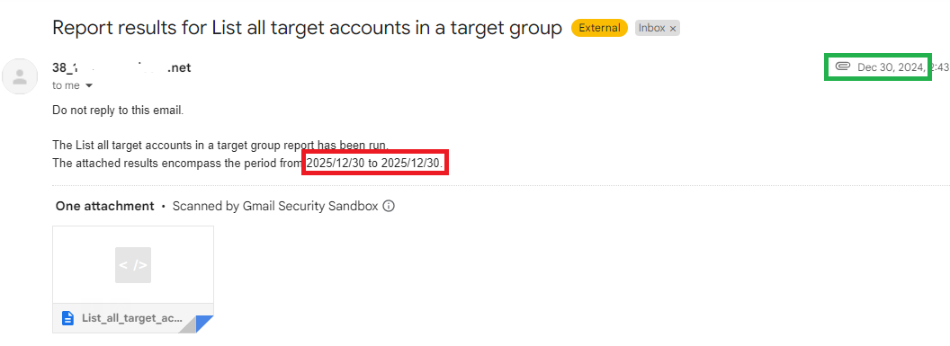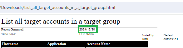 A daily report is configured on the Credentials > Reports > Scheduled Jobs page to list all target accounts in a target group. The report is sent to the recipients configured in the scheduled job. During the last week of December, the emails showed the wrong dates in the body: