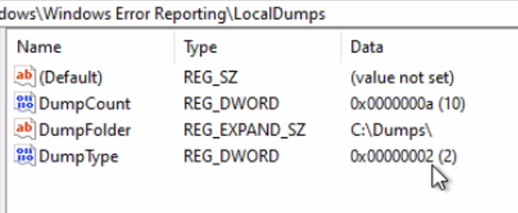 iii. "DumpType" as a REG_DWORD to 2 // this creates a full process dump