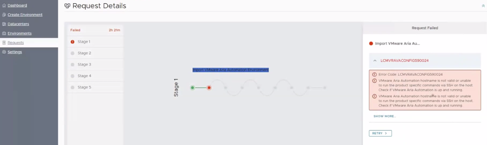 VMware Aria Automation hostname is not valid or unable to run the product specific commands via SSH on the host. Check if VMware Aria Automation is up and running.