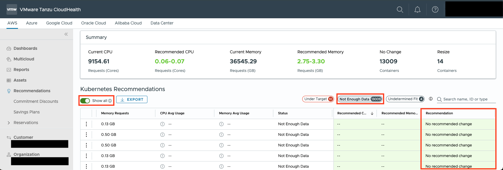 All Kubernetes workload types (REPLICASET, STATEFULSET, JOB, DEPLOYMENT etc) can show as "No recommended change".