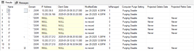 select c.Name, cid.Domain, ip.[IP Address], cid.[Client Date], isnull(cast(rus.ModifiedDate as nvarchar(24)), 'no record') as ModifiedDate, c.IsManaged, @purgeMethod as [Computer Purge Setting], case when (rus.ModifiedDate is null or c.IsManaged = 0) then 'Never' when @delete = 0 then '' when @delete = 1 then 'Delete on '+cast((rus.ModifiedDate + @totalDaysDelete) as nvarchar(25))