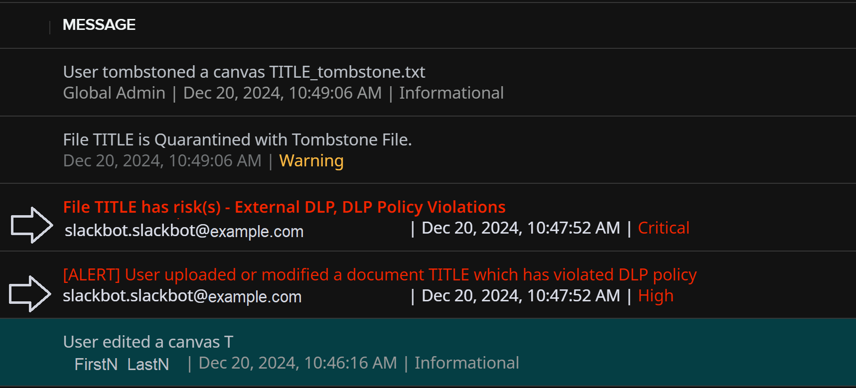 In many cases, when a Canvas object is created , Slack marks the owner as "SLACKBOT" , not the actual user who created it. this behavior is reflected on the DLP incidents when they get raised against a Slack Canvas object.