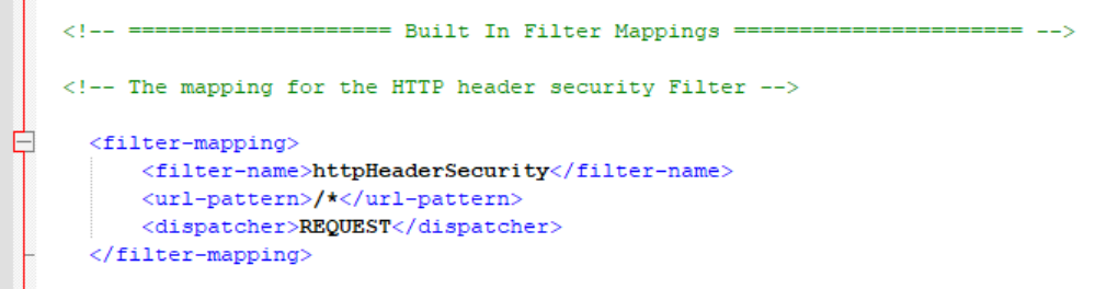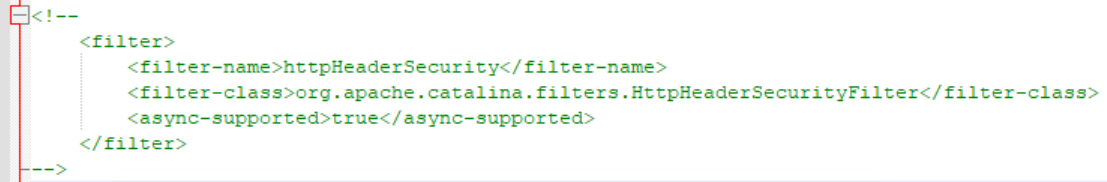 Search for the httpHeaderSecurity <filter> definition section and the <filter-mapping> section, as shown below. (In total, you will need to uncomment ‘httpHeaderSecurity’ at 2 places in the file)