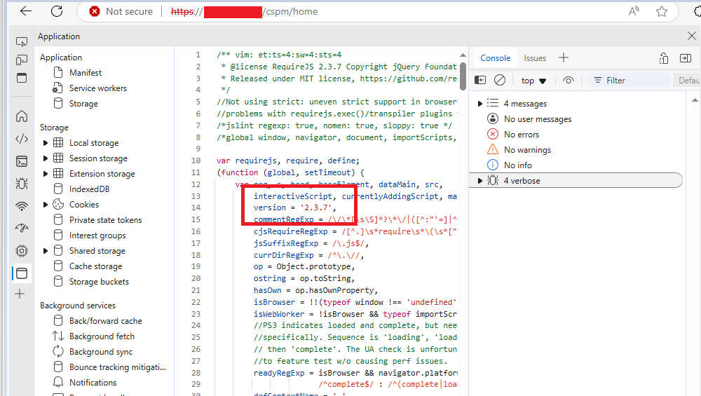 3. Navigate in Developer tool to Applications and expand the Frames under top -> JavaScript -> click over require.js. This will show in the left panel the code of requirejs version = '2.1.6'.
