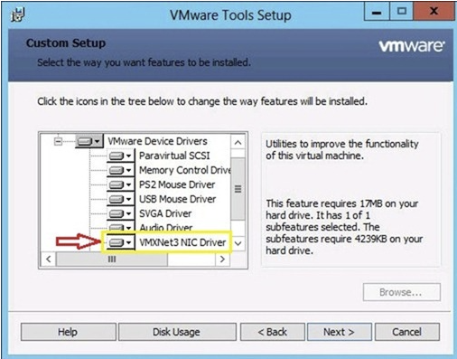 - Selecting the custom setup option, beneath VMware Device Drivers to install the vmxnet3 driver.