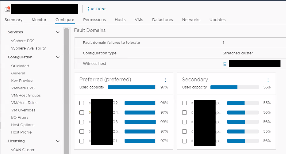 It's imperative to properly monitor the space utilization of a stretch cluster, otherwise it can result in running either low on space or out of space in a single fault domain while the other fault domain is barely used.