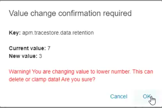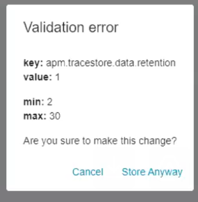 We would like to reduce APM traces retention from default 7 days to 1 or 2 but we get a "Validation error" in Cluster Management when reducing the value: