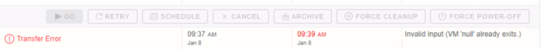 2025-01-08 13:25:25.856 UTC [OsAssistedReplicationService_SvcThread-12351, Ent: HybridityAdmin, , TxId: ########-####-####-####-45edff9bd4e0] ERROR c.v.v.h.s.o.jobs.FailTransferJob- [transferId:'########-####-####-####-994577a6173e' sid:'########-####-####-####-cac7c6bf7386' jobId:'########-####-####-####-990fbfc0fae5' hostname:'#####'] Invalid Input (VM 'null' already exits.)