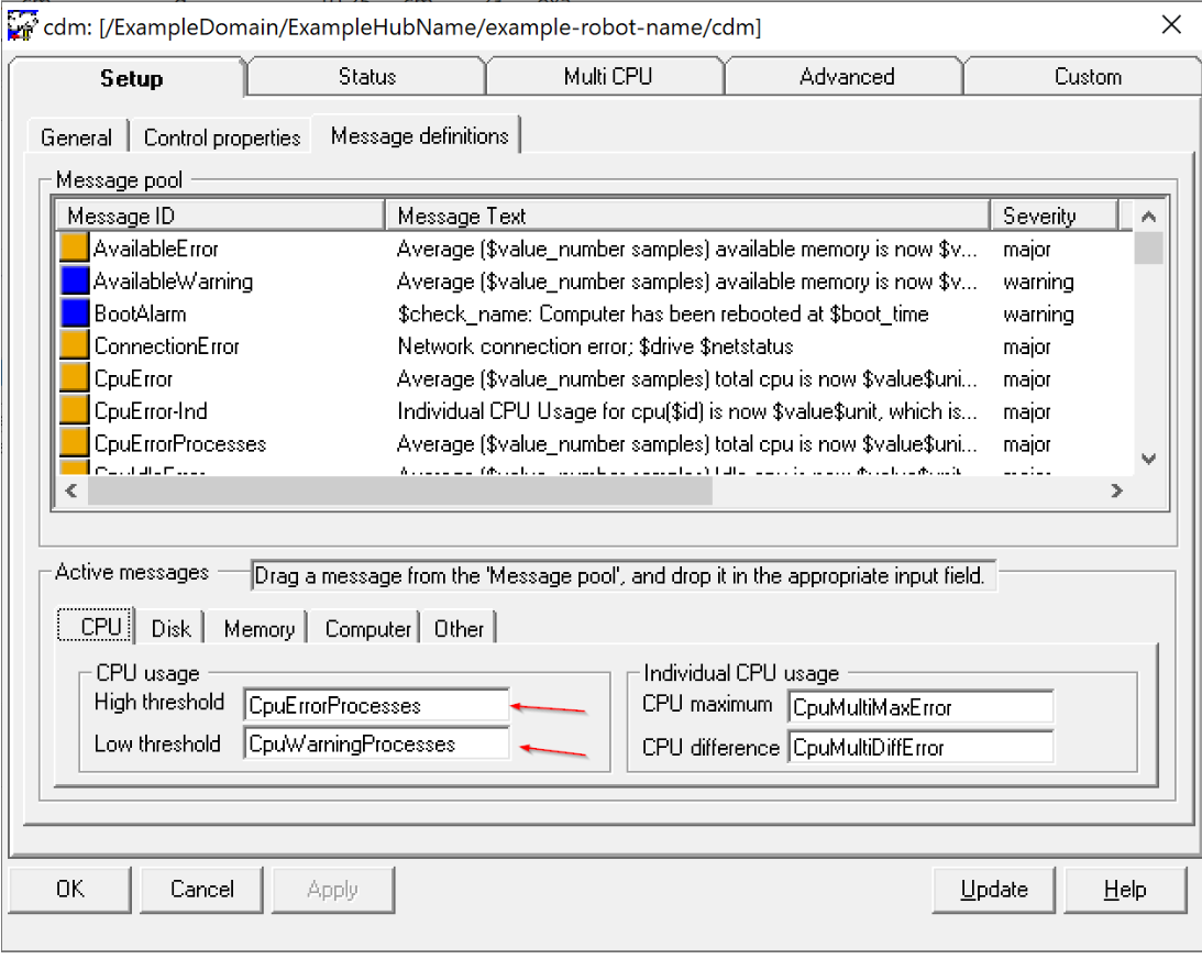 To change these messages within the CDM GUI it is a drag-and-drop operation. Locate the message in the list called "CpuError" and drag/drop it on top of "CpuErrorProcesses" to change the message, then do the same thing with "CpuWarning", drag/drop on top of "CpuWarningProcesses" to change it, then click Apply/OK.