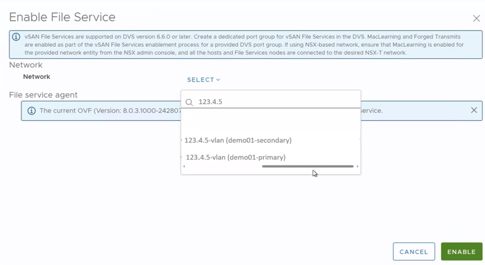 The Network chosen in the Enable File Services dialog is an NSX Segment defined on separate vSphere Distributed Switches(vDS) at each site using an NSX sub-transport node profile.