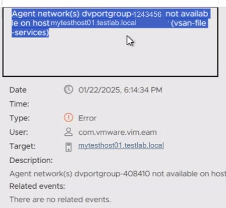 VMware vSAN File Service Agent network(s) "dvportgroup-XXXXXX" not available on host