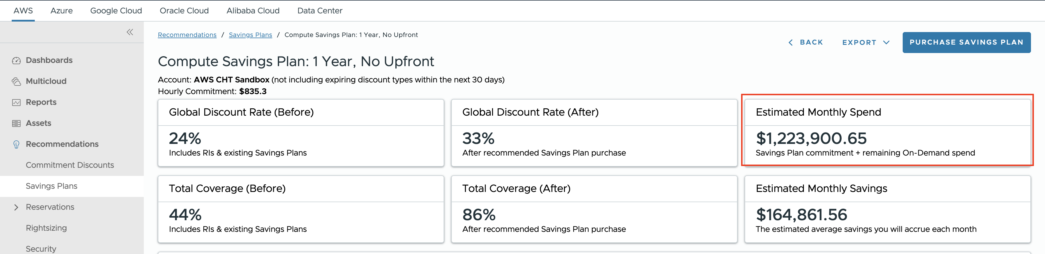 Estimated monthly spend just includes the Saving plan (which is recommended) plus the remaining on-demand spend which will not be covered, however it does not include EC RI's and spot instances.