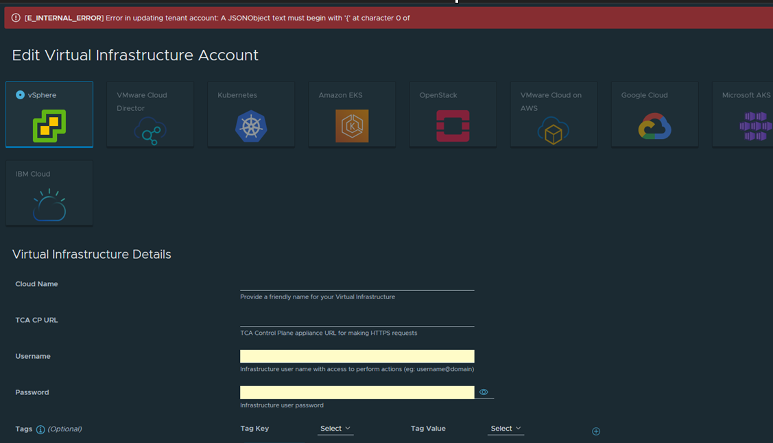 [E_INTERNAL_ERROR] Error in updating tenant account: A JSONObject text must begin with '{' at character 0 of