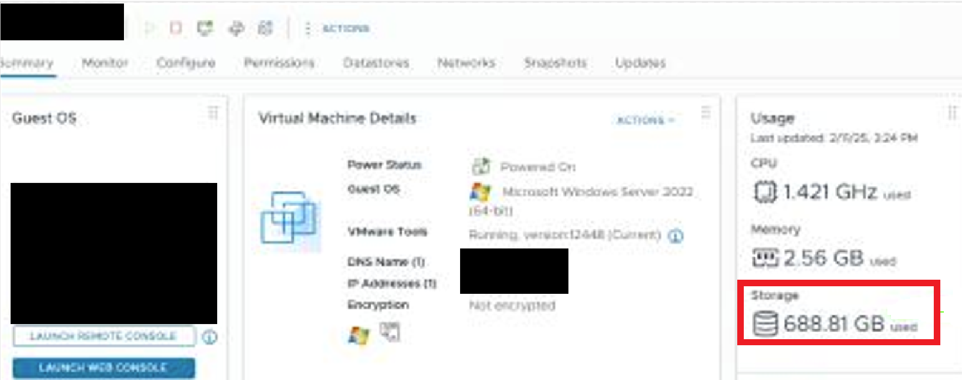 Despite the fact the allocated space has not been used yet, the Web Client is showing the space provided by the added RDM disk under "Storage",