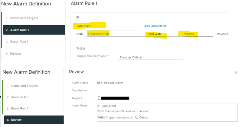 Select ESXi host -> Select Configure -> Select Alarm Definitions -> Select ADD - Create below Arguments