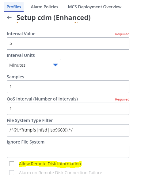 The 'Allow Remote Disk Information' setting in the Setup cdm (Enhanced) MCS profile provides the capability to manage where NFS Filesystem metrics are displayed.